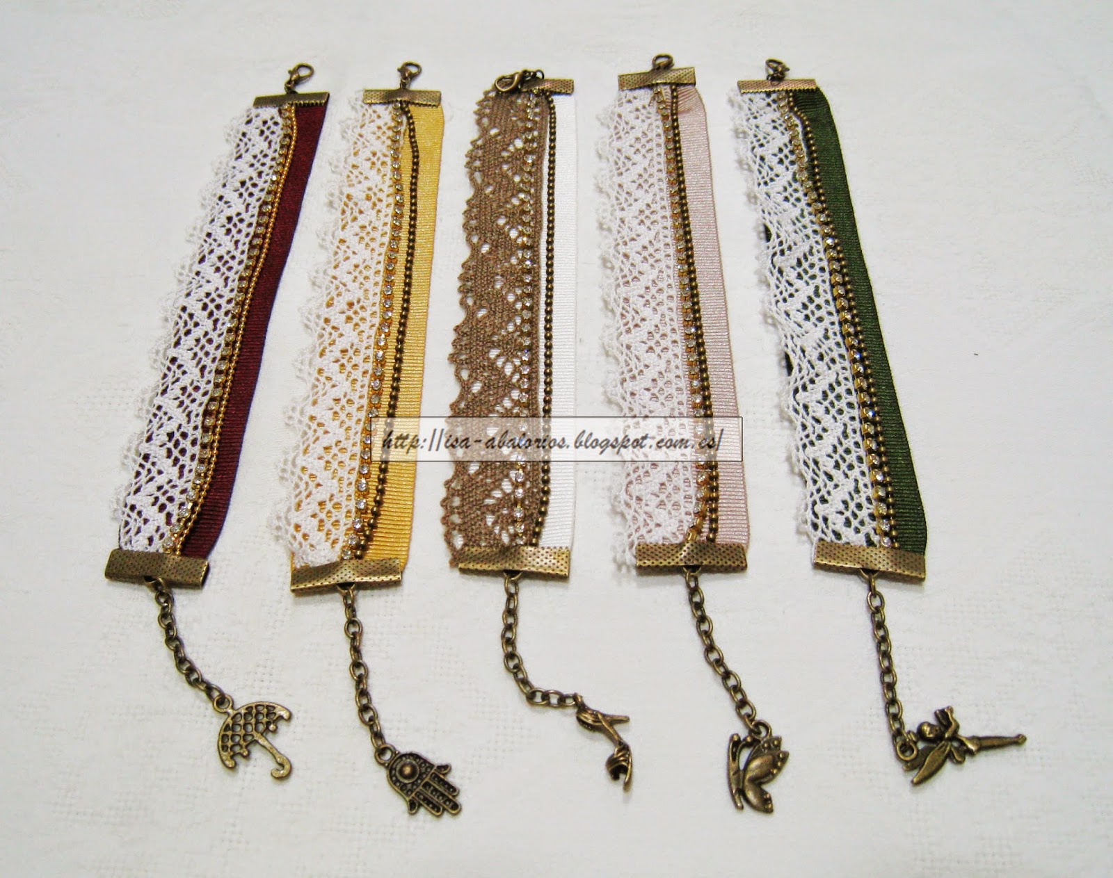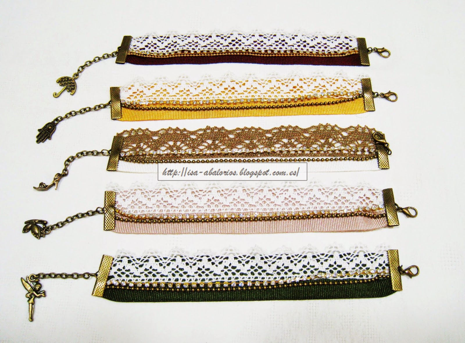 Pulseras con cinta plisada, puntilla, cadenas de metal y de strass con colgante.