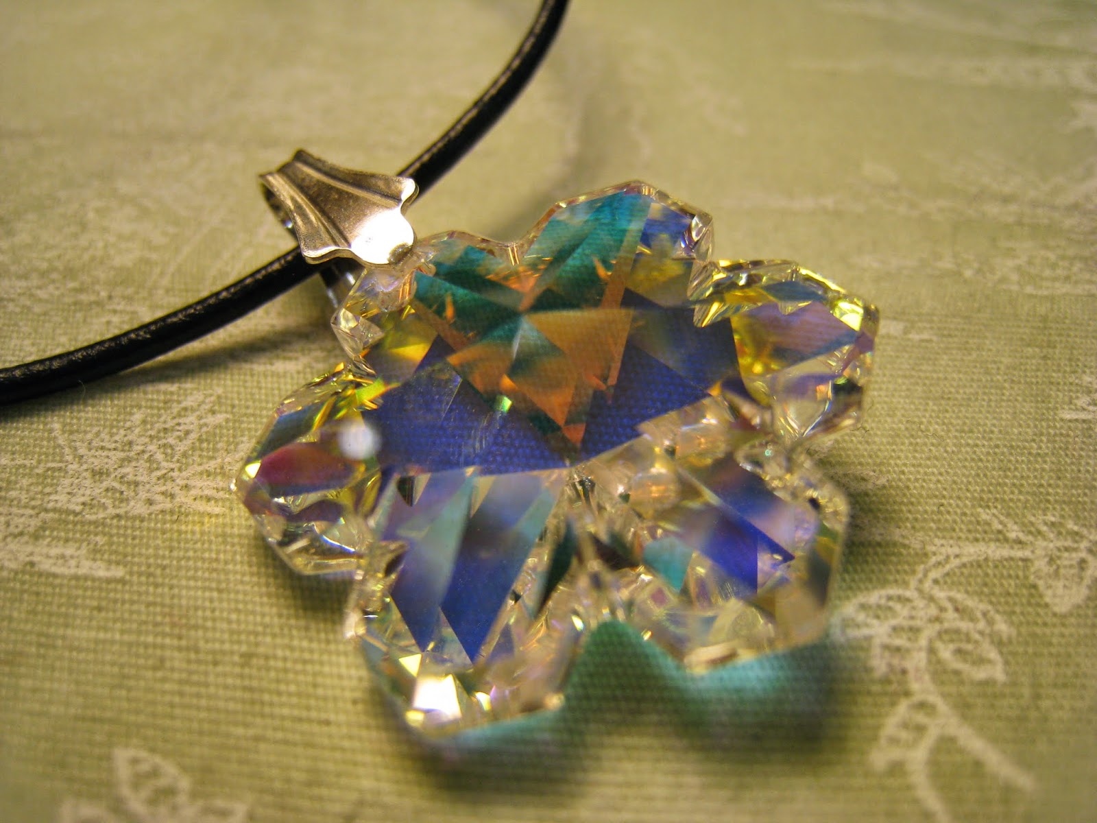 Esta cuenta de Swarovski se llama "copo de nieve" y tiene la propiedad de reflejar distintos colores en función del color de la base sobre la que se apoya.